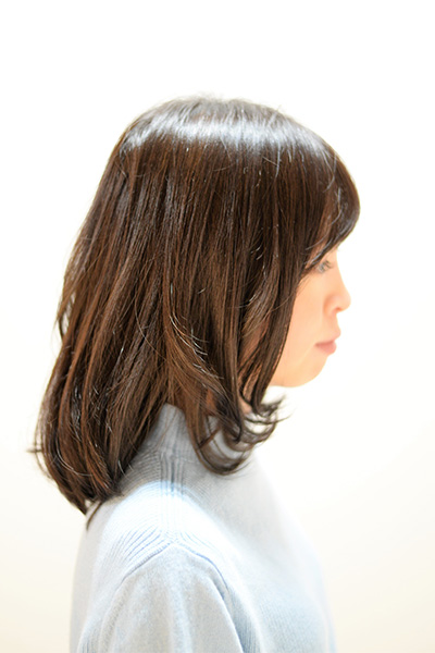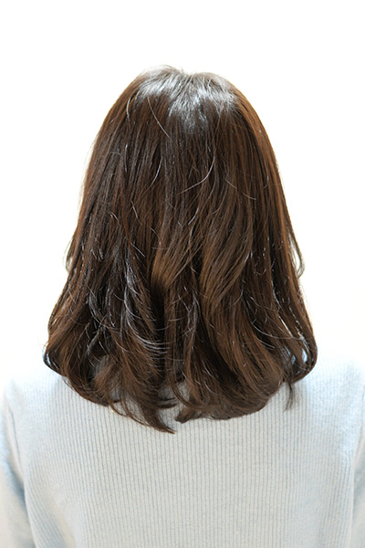 根元をドライヤーでしっかり乾かしてふんわり感を出してコテで毛先ワンカール毛先に艶出しクリームつけて束感を。