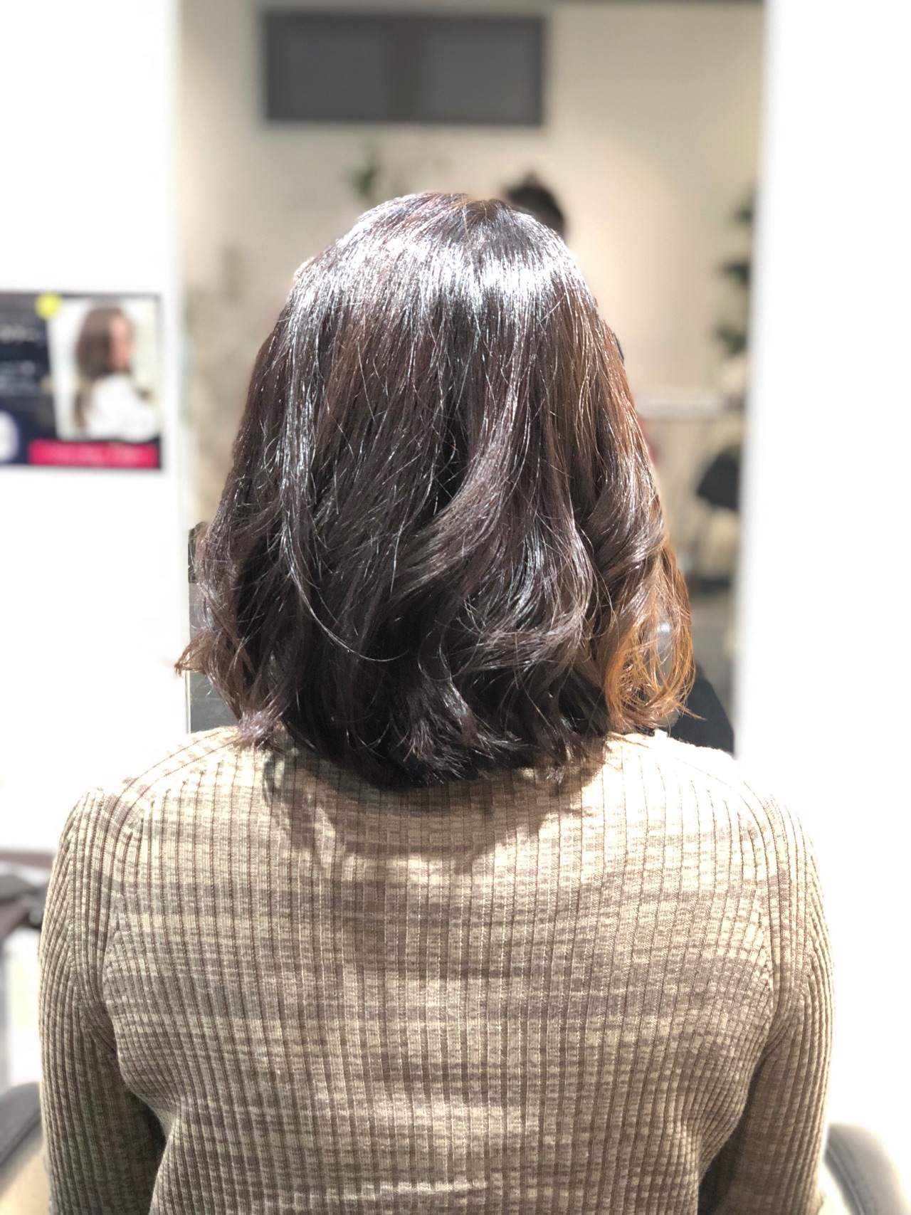 毛先をランダムに巻いてほぐしながらN.バームをつけて出来上がり巻くのが苦手な人は負けるようになるまでご指導いたします♪